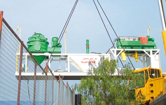 將鉆屑甩干機,和鉆井液離心機的升降支架降到最低處,放在翹座上,能夠滿足大部分地區(qū)內陸運輸的要 求,無須拆卸甩干機和離心機。