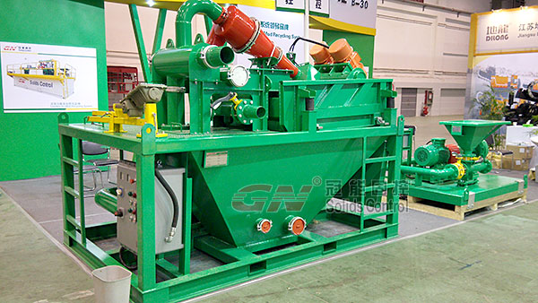 本次展會(huì)主要展出了120m³/h處理量的泥漿回收系統(tǒng)及配套的射流混漿系統(tǒng),主要配置了一臺(tái)GNZY753E-Y1S型篩泥一體機(jī),雙層篩網(wǎng)設(shè)計(jì),面積達(dá)到2.225m³,可分離固相粒度40微米,旋流器采用高質(zhì)量聚氨酯材質(zhì),耐磨,使用壽命長(zhǎng),振動(dòng)電機(jī)采用國(guó)際意大利OLI品牌或者美國(guó)馬丁品牌,篩箱底框采用不銹鋼材質(zhì),振動(dòng)強(qiáng)度達(dá)到7.1G(可調(diào)),并配有GNSB6×5A(37KW)離心泵為除泥供漿泵,采用機(jī)械密封,使用壽命長(zhǎng)并便于維修。整套系統(tǒng)撬裝設(shè)計(jì),移動(dòng)便捷,使用方便。