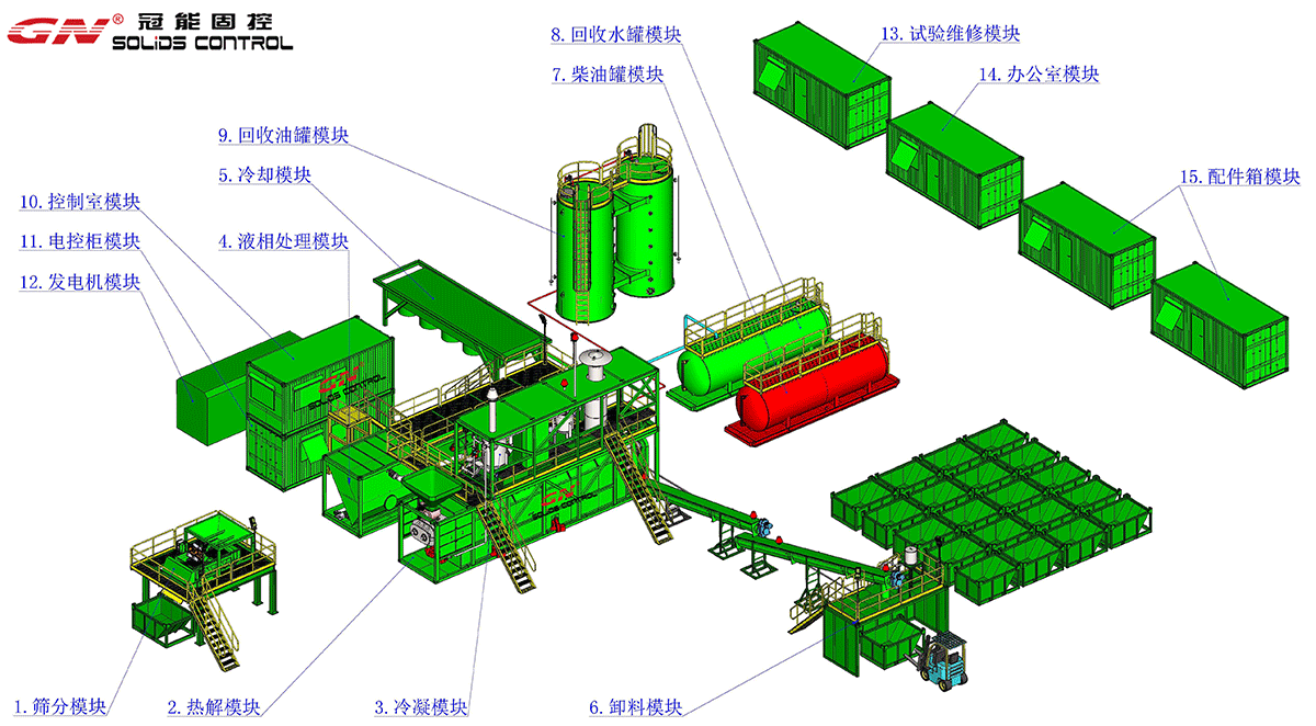 序號 名稱 數(shù)量 描述 選擇項 1 篩分模塊 1 進(jìn)入熱解吸爐之前,對大顆粒物進(jìn)行篩分 必選 2 熱解吸模塊 1 包含6個燃燒機,對物料進(jìn)行間接加熱熱解成蒸氣 必選 3 冷凝模塊 1 對蒸氣進(jìn)行除塵冷凝成油水固混合物 必選 4 液相處理模塊 1 對油水固三相進(jìn)行分離處理 必選 5 冷卻模塊 1 對冷凝模塊來的熱水進(jìn)行循環(huán)冷卻處理 必選 6 卸料模塊 1 包括卸料冷卻螺旋,卸料噴淋系統(tǒng) 必選 7 柴油罐模塊 1 用于儲存給燃燒機的燃油,并給燃燒機供油 必選 8 回收水罐模塊 1 用于儲存回收到的水 可選 9 回收油罐模塊 2 用于儲存回收到的油 可選 10 控制室模塊 1 操作人員在控制室對系統(tǒng)進(jìn)行監(jiān)控操作 必選 11 電控室模塊 1 用于變頻器和電控柜安裝 必選 12 發(fā)電機模塊 1 用于給整個系統(tǒng)提供電力 可選 13 試驗維修模塊 1 用于樣品測試和設(shè)備維修 可選 14 辦公室模塊 1 經(jīng)理和工作人員辦公 可選 15 配件箱模塊 2 一個用于儲存電氣配件,一個用于儲存機械配件 可選 備注說明:以上選擇項,注明可選的表示用戶可以從冠能公司購買或自行準(zhǔn)備或者,注明必選項的必須從冠能公司購買,否則無法滿足整個系統(tǒng)匹配工作。通常冠能公司的熱解吸系統(tǒng)的報價指包含必選項目,可選項目需要額外報價。